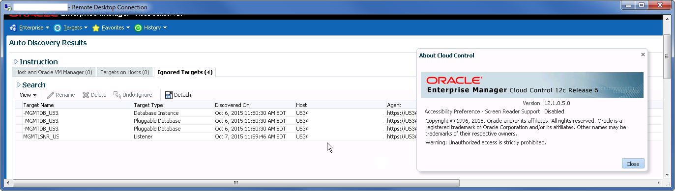 However, Oracle Enterprise Manager Cloud Control 12.1.0.5.0 and earlier sees this oracle database, PDB, listener and all, and decides to discover it. This is incorrect and should not happen. It is supposed to be “masked off” from OEM. Monitoring this database system will only lead to false positives and problems where none really exist, and all of the targets should be ignored (as per the attached picture)
